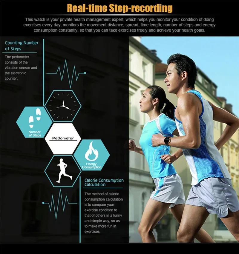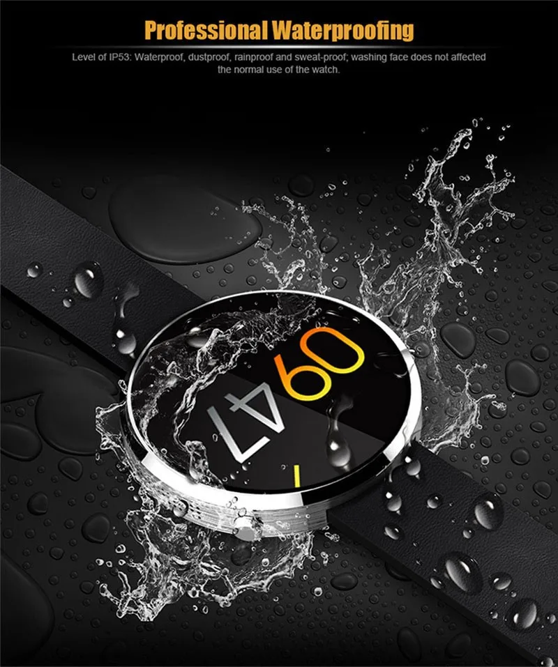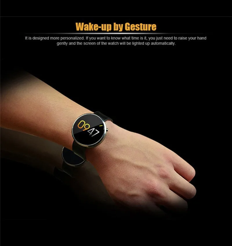 Function: heart rate monitor,sync a call/sms/music played via bluetooth, camera shutter Remote taking photo,Sleep Monitor,audio recording,Sports Pedometer,wake-up by gesture, voice control, automatic page turning by shaking wrist, anti lost alarm, real time step recording,phone book