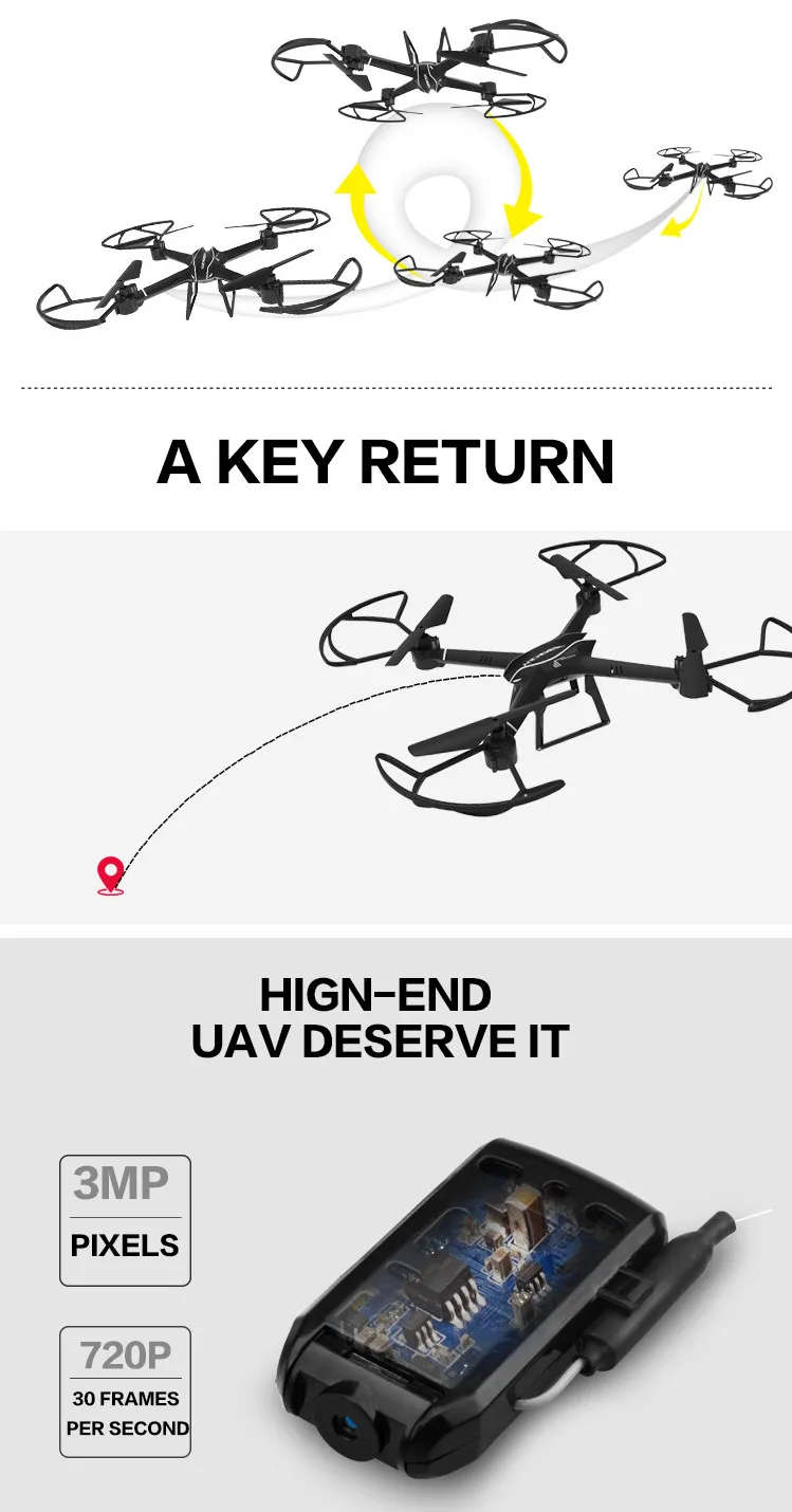 Product features: up / down / forward / backward / left / right / 360 ° roll / left fly / right fly / headless mode / takeoff, landing / a key return / correction / emergency landing
