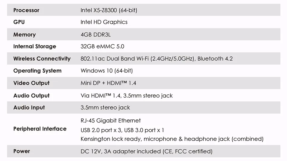 An included 32GB of eMMC (5.0) built-in storage, 4GB of DDR3L memory and pre-installed with Windows 10 (64-bit) ensures NEO Z83-4 is ready to run out of the box.