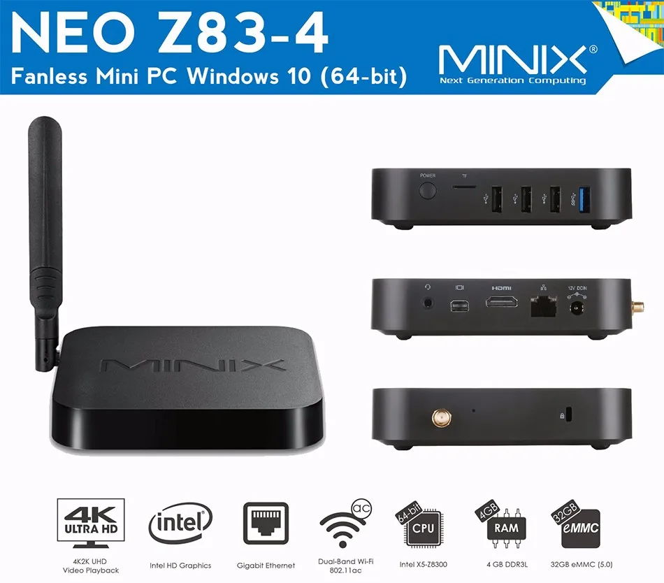 Original MINIX NEO Z83-4 Windows 10 Home TV Box Intel Atom X5-Z8300 1.44GHz 4G/32G 802.11ac 2.4/5GHz WiFi HDMI Smart TV Box IPTV