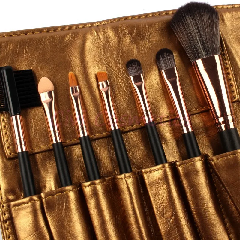 Sale! High Quality 7 Makeup Brush Set Kit in Sleek Golden Leather Bag Portable Make up Brushes