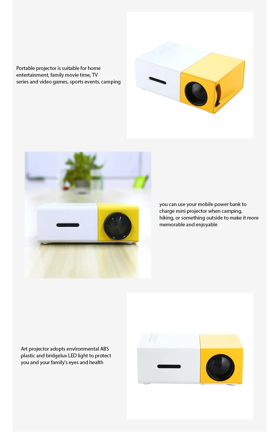Entertainment Partners: Supports 5V/2A power supply, you can use your mobile power bank to charge mini projector when camping, hiking, or something outside to make it more memorable and enjoyable.